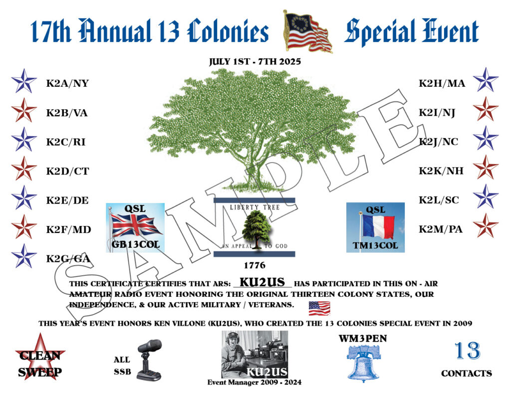 13 Colonies Special Event 2025 Posted on 2025-07-01 13 Colonies Special Event – http://www.13colonies.us/ Spots – http://dxsummit.fi/#/?dx_calls=K2A,K2B,K2C,K2D,K2E,K2F,K2G,K2H,K2I,K2J,K2K,K2L,K2M,WM3PEN,GB13COL,TM13COL 20m FT4 20m FT4 20m FT8 15m FT8 15m FT8 15m FT8 20m FT4